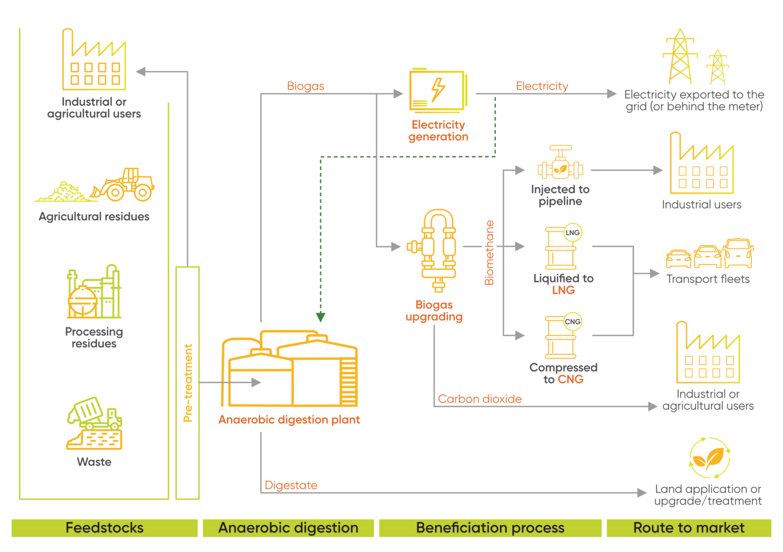 Energy generation: The biogas is captured and used to generate clean, renewable electricity and heat.